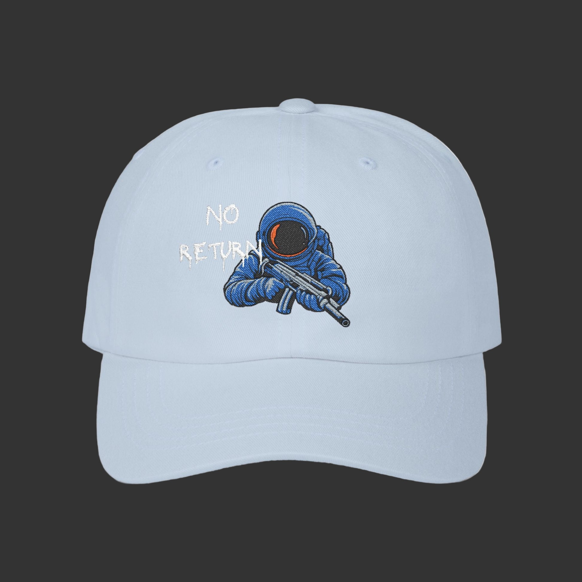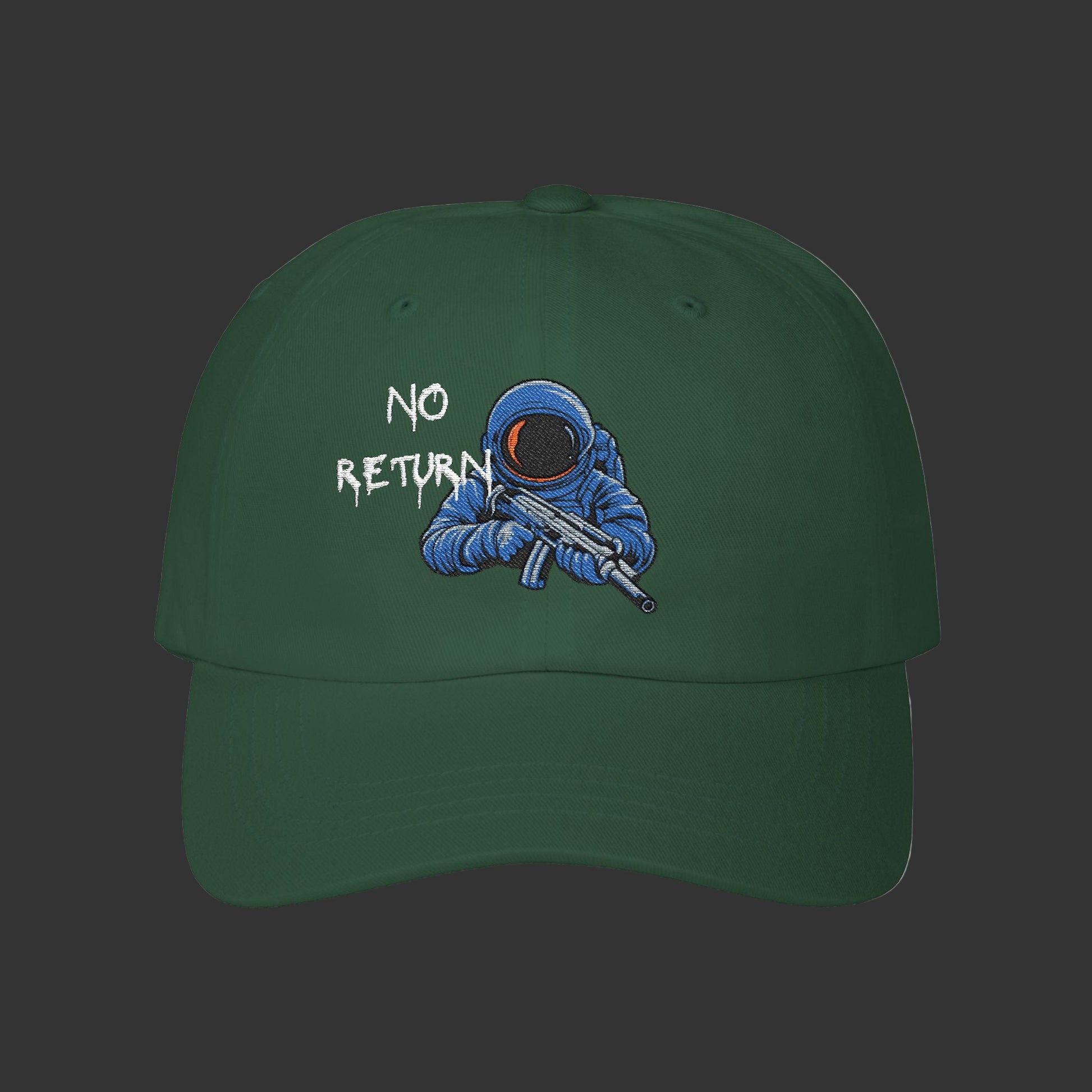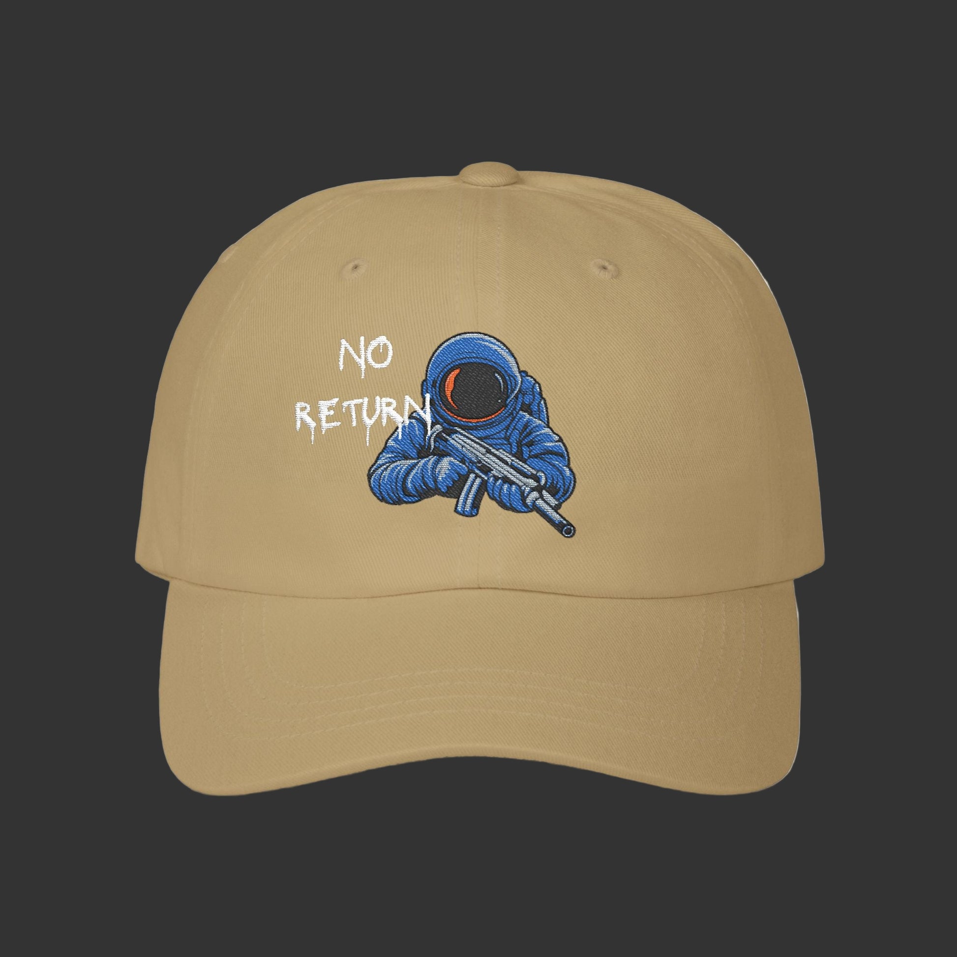 NoReturnApparel dad cap. Vintage brass buckle, breathable cotton, low-profile fit. Timeless style for the emotionally unavailable. One way. No return.