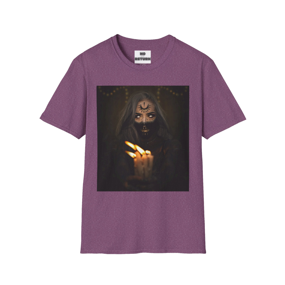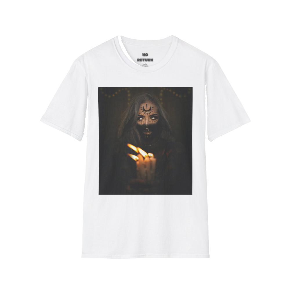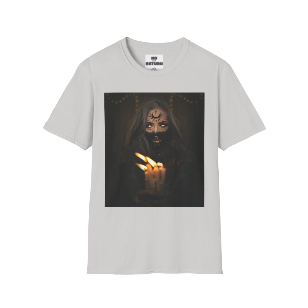 The figure on this shirt holds a burning candle in the dark — not as a request for saving, but as a reminder :