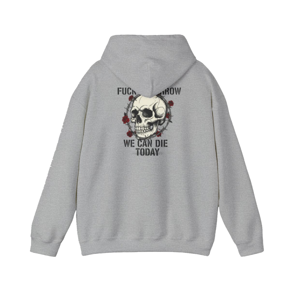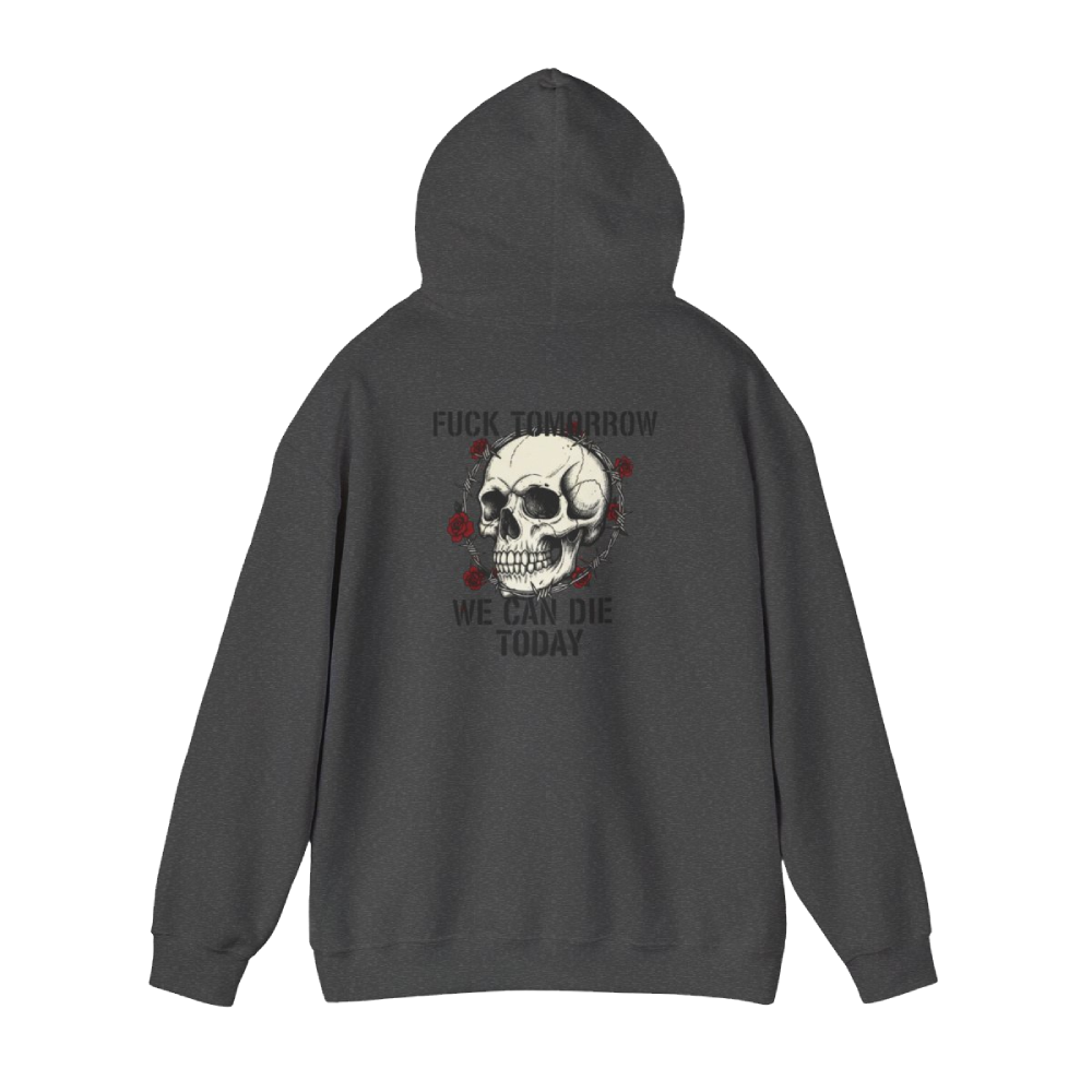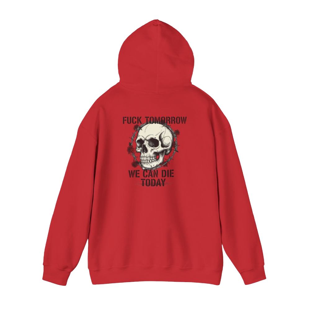 Live for today. Tomorrow isn't promised. The "Fuck Tomorrow" hoodie from our Live or Die Collection features a bold skull and roses back print with unapologetic messaging. Built for those who refuse to play it safe. Premium heavyweight fleece. Oversized fit. Made to order. Not built for comfort. Built for truth. FEATURES: - Heavyweight 8oz fleece (50% cotton / 50% polyester) - Oversized streetwear fit - Ribbed cuffs and waistband - Front kangaroo pocket - Large back print design - Unisex sizing - Made to order - 5-7 day production SIZING: Runs oversized. For regular fit, order your normal size. For extra oversized look, size up. Part of the Live or Die Collection - streetwear for the restless and rebellious.