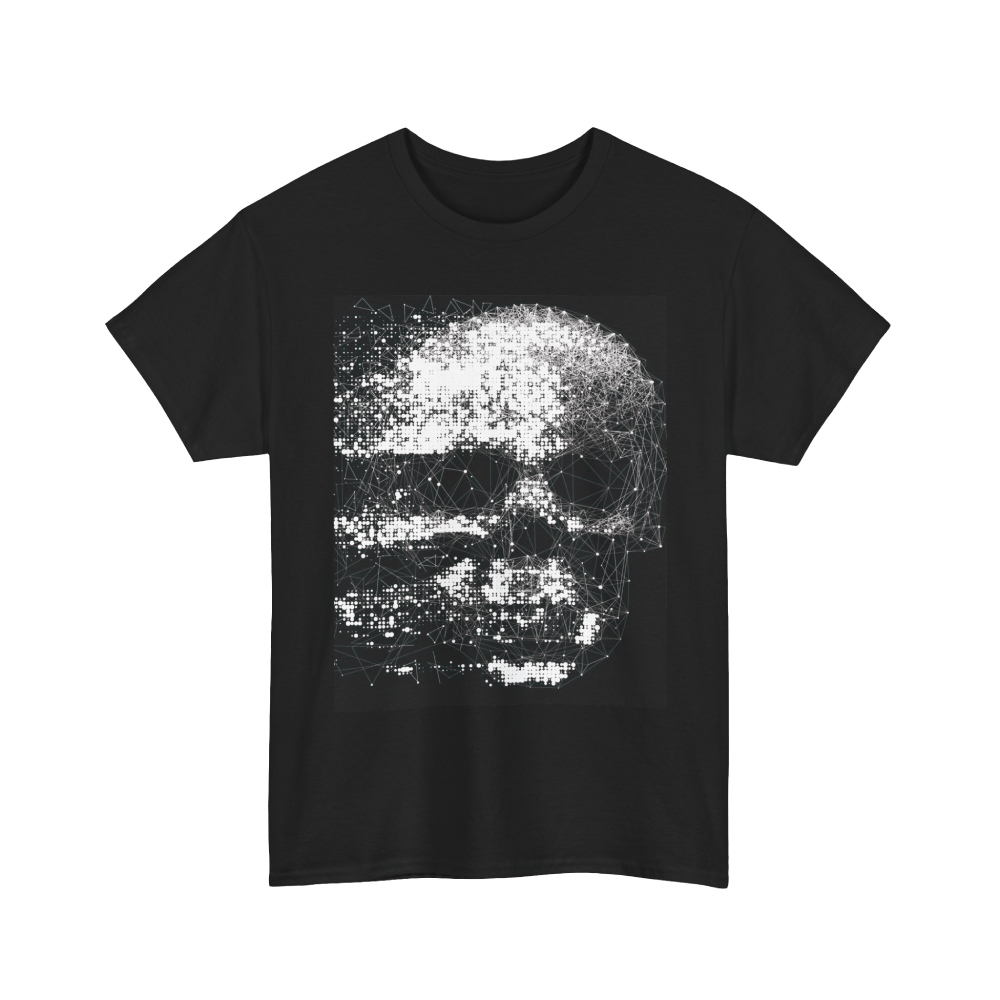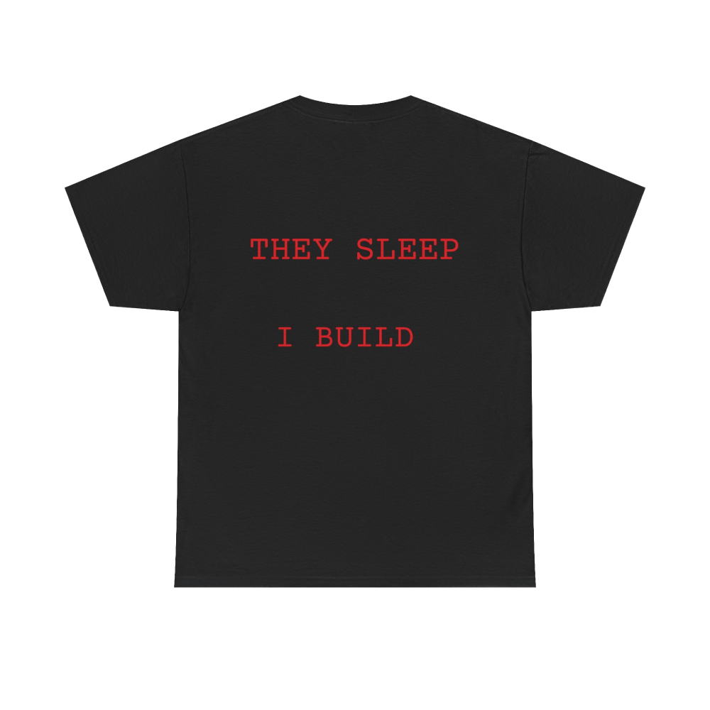 This classic black tee carries a raw, nocturnal energy. A grainy white skull print sits on the chest like a memory caught on old film, all grit and shadow. On the back, bold red text reads "THEY SLEEP / I BUILD" — a short, defiant statement for late-night makers, coders, and grind-culture creatives. The silhouette is relaxed and roomy; the fabric feels sturdy but breathable. Wear it with a worn denim jacket or under a hoodie during all-nighters. It sits in the wardrobe like a badge for people who trade sleep for craft, signaling quiet obsession without shouting.