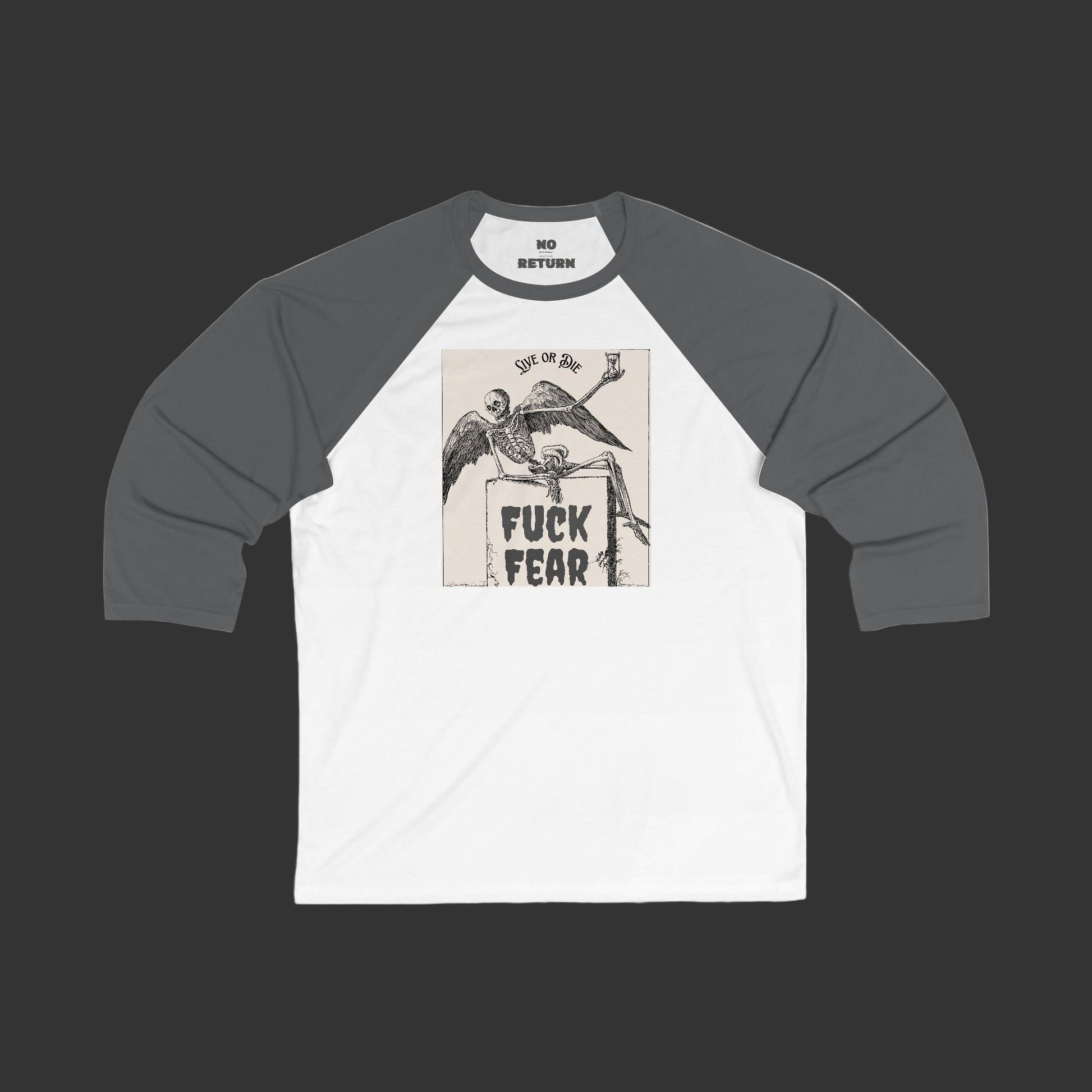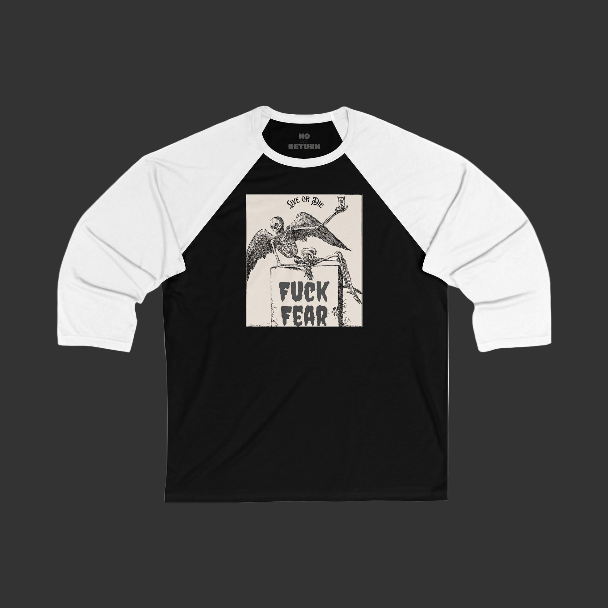 NoReturnApparel baseball tee. Lightweight ¾ sleeve shirt with contrast framing, modern fit, and sad aesthetic. One way. No return.